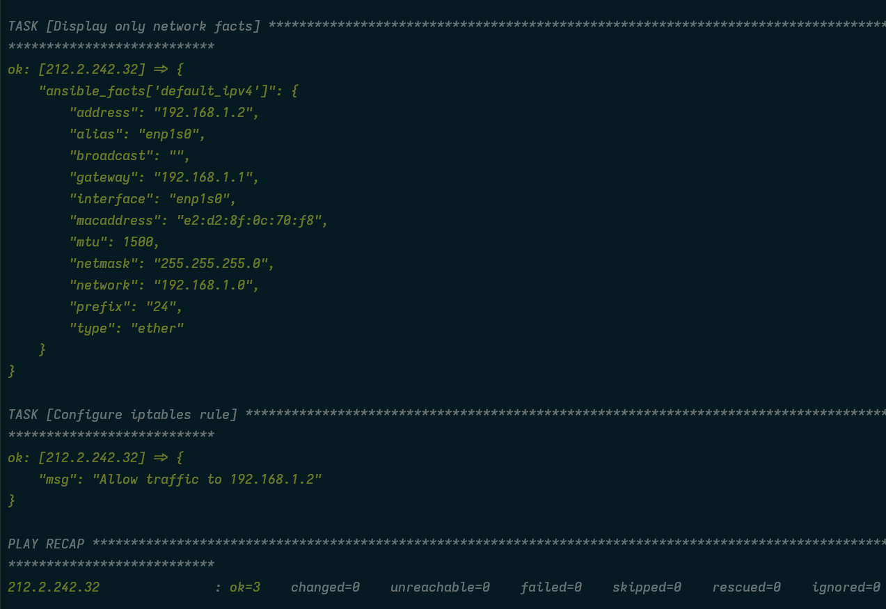 It’s worth noting that this playbook is not particularly useful on its own. It dumps every fact Ansible has collected, which can be overwhelming and hard to parse.