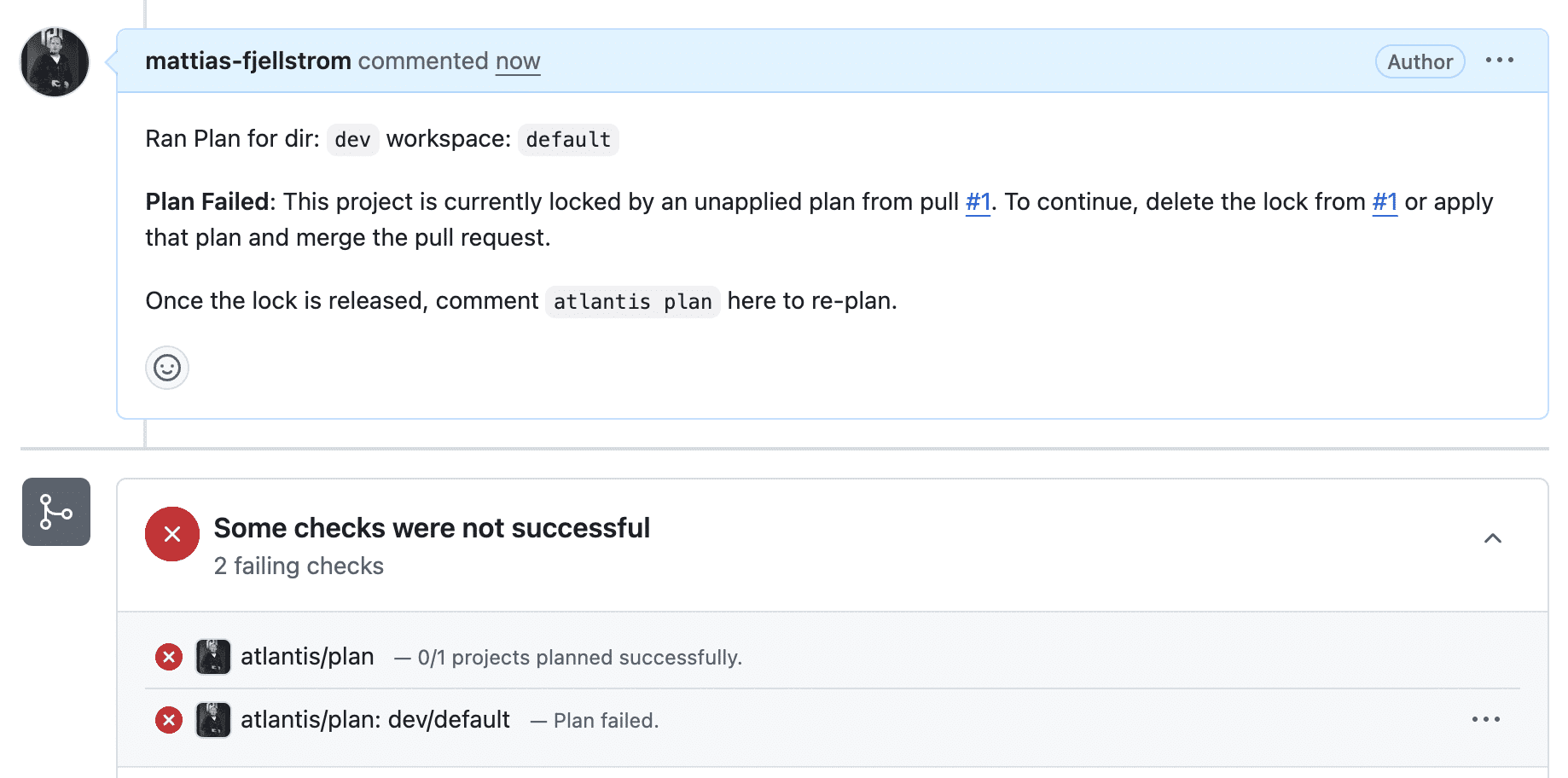 This means that if you open a different PR targeting the same project (the dev project in this case) while this lock exists, Atlantis will report an error: